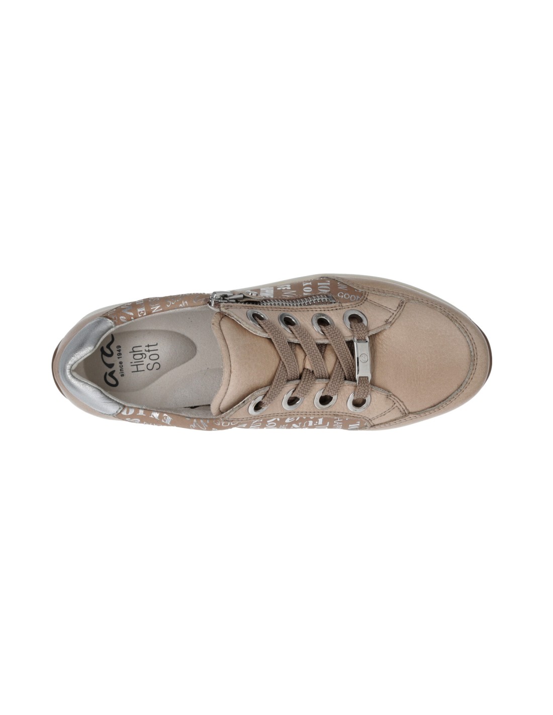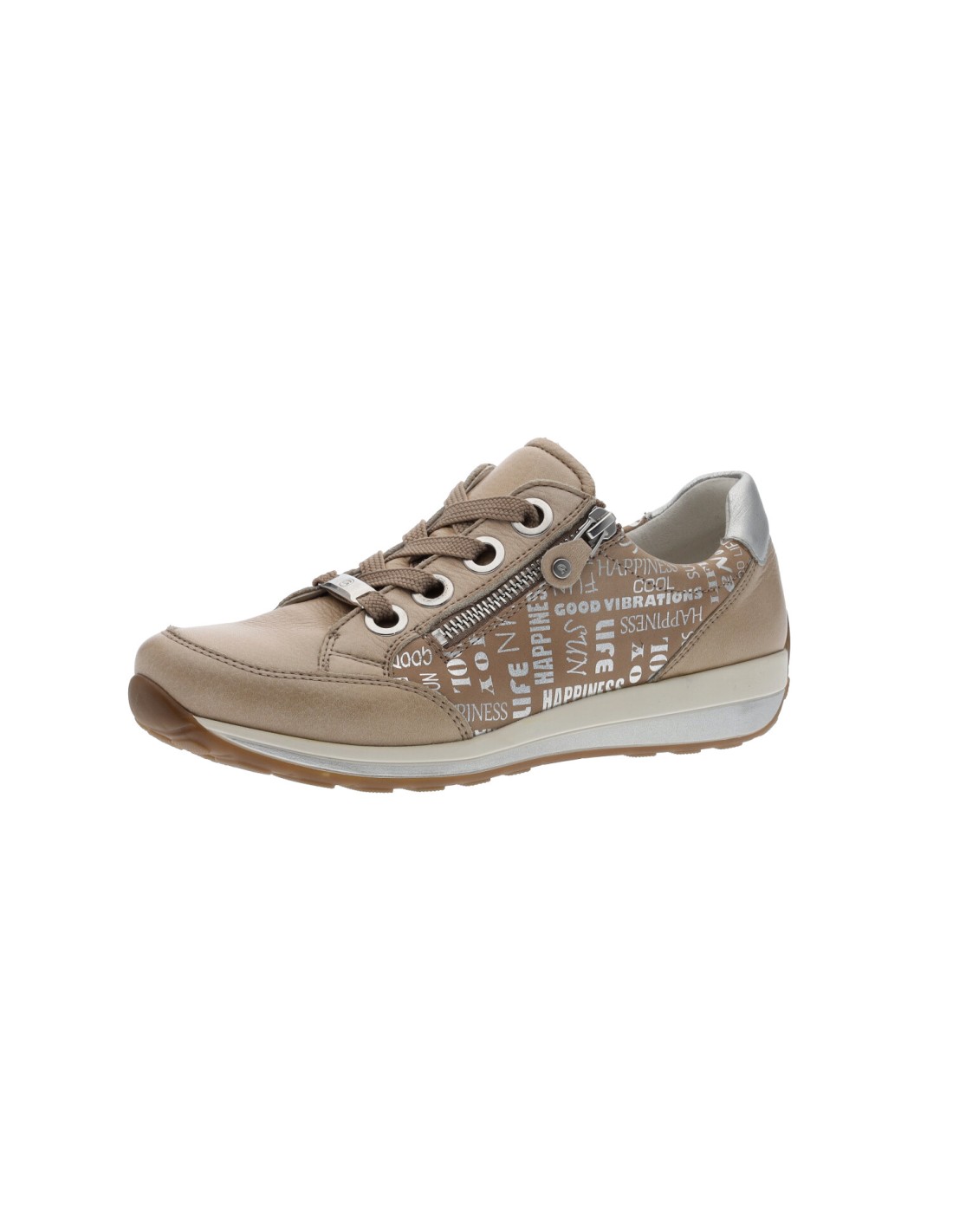 Deportivo de señora en Calf Sand y piel grabada al tono y Platino, ancho H, altura 25mm, funciones High Soft y plantilla extraíble.