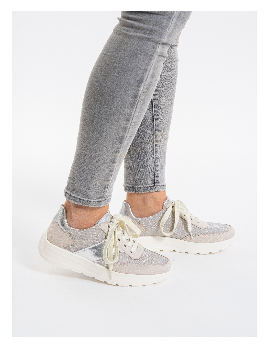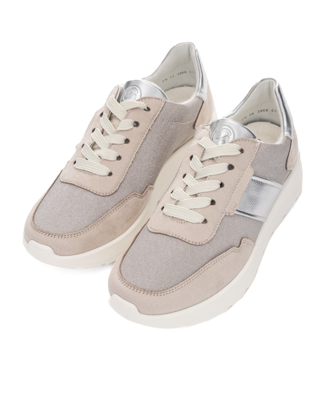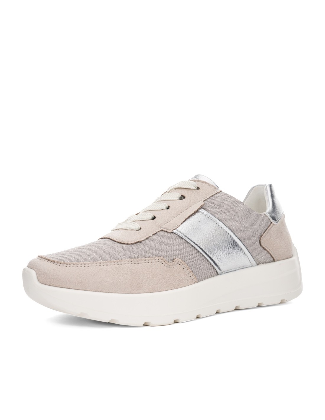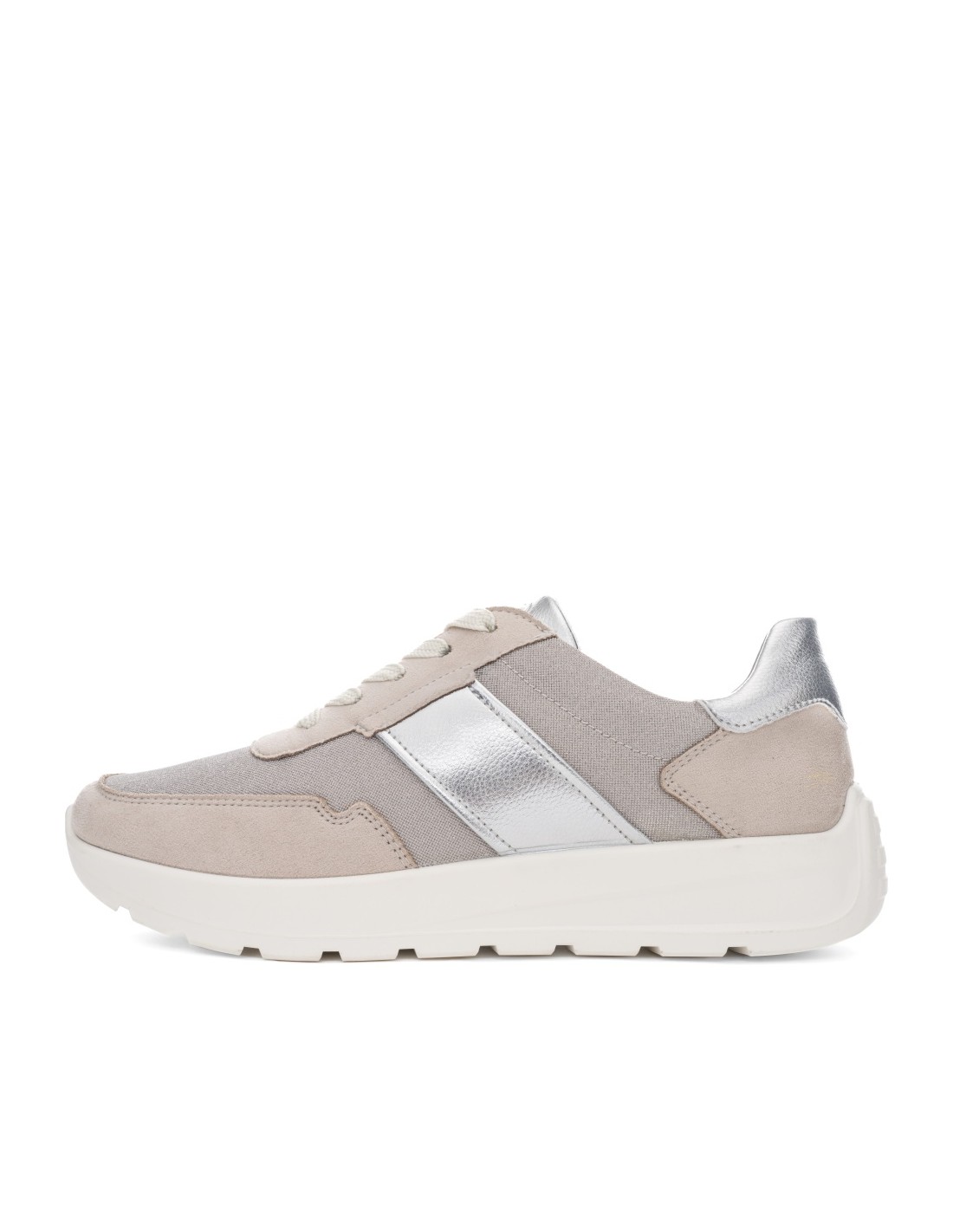 Zapatilla deportiva con cordones, diseñada en una combinación moderna de tejido, gamuza y material metalizado. Sus tonos grises y plata aportan un estilo sofisticado y versátil, perfecto para cualquier ocasión. El piso de poliuretano y TPU de 35mm de altura garantiza comodidad y durabilidad, ofreciendo soporte en cada paso. Ideal para quienes buscan una opción deportiva, elegante y funcional. ¡Hazla parte de tu colección y marca la diferencia!