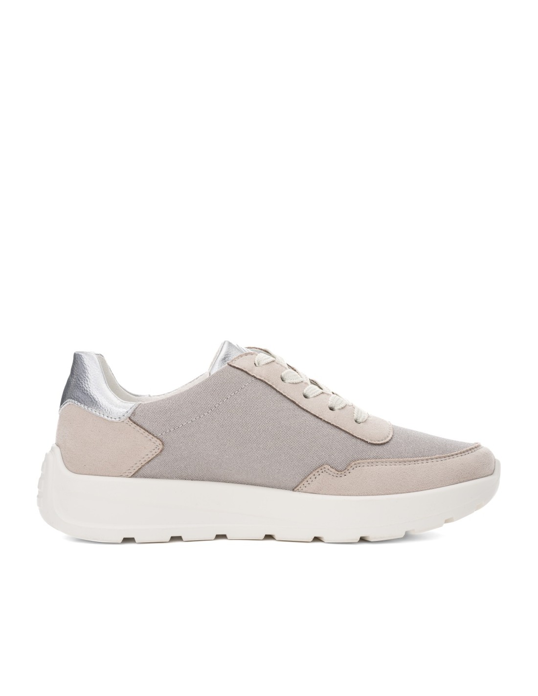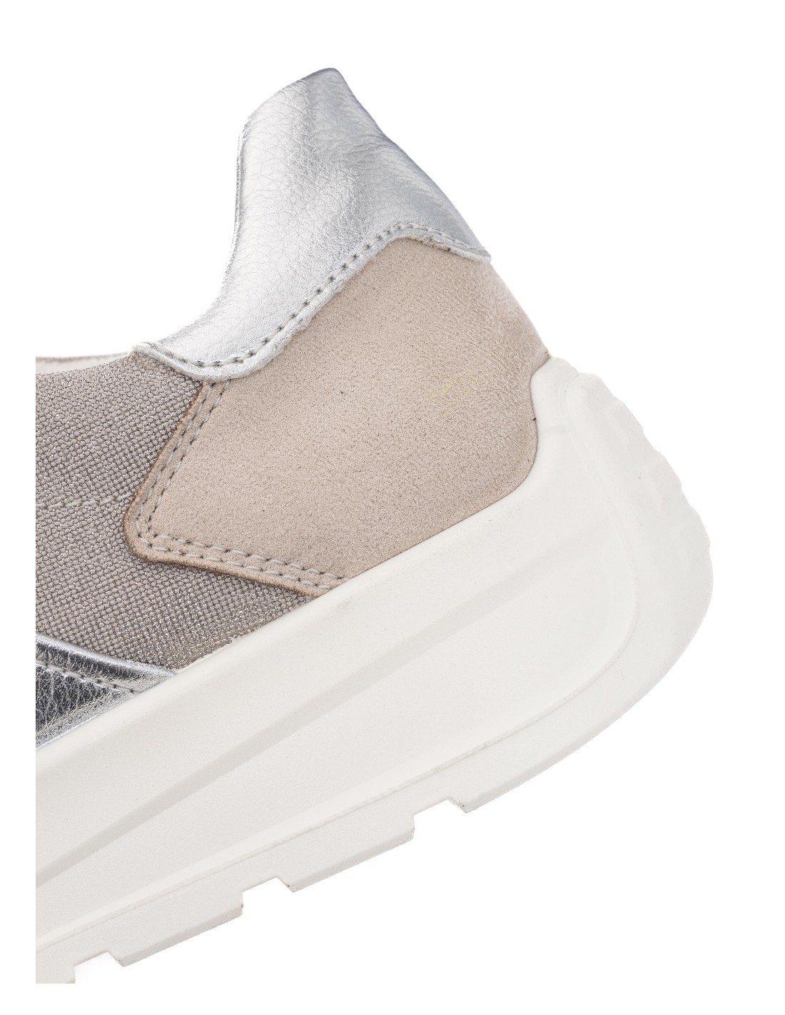 Deportiva en tejido, gamuza y material metalizado, combinada en colores grises y plata. Forro Bamboo y piso de Poliuretano y TPU