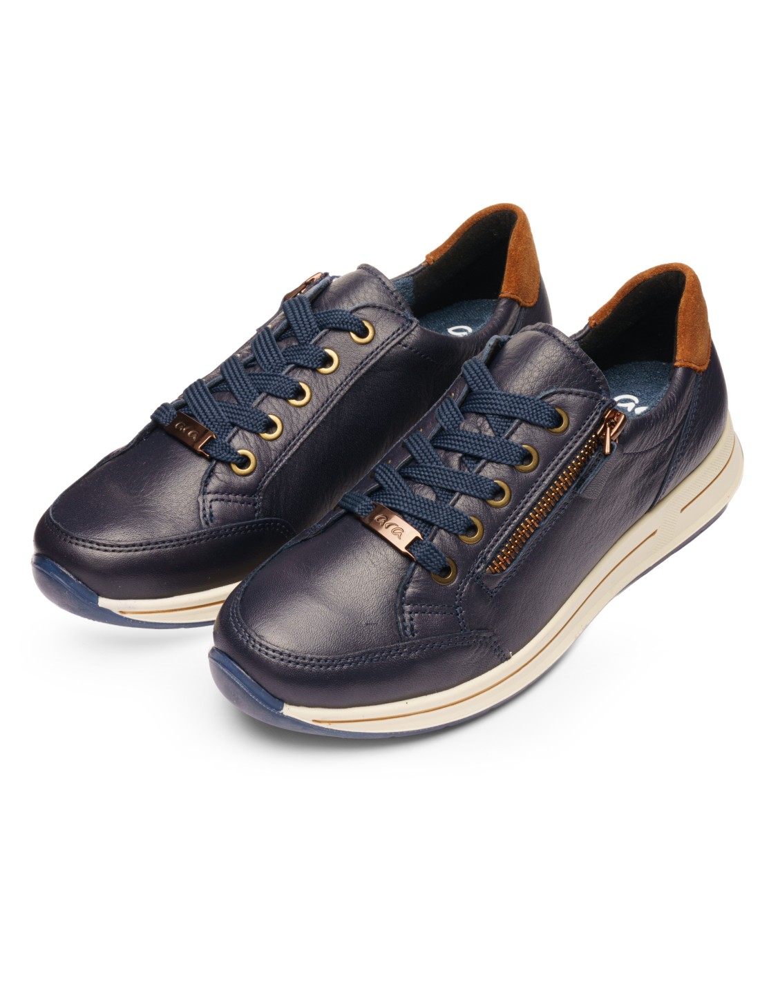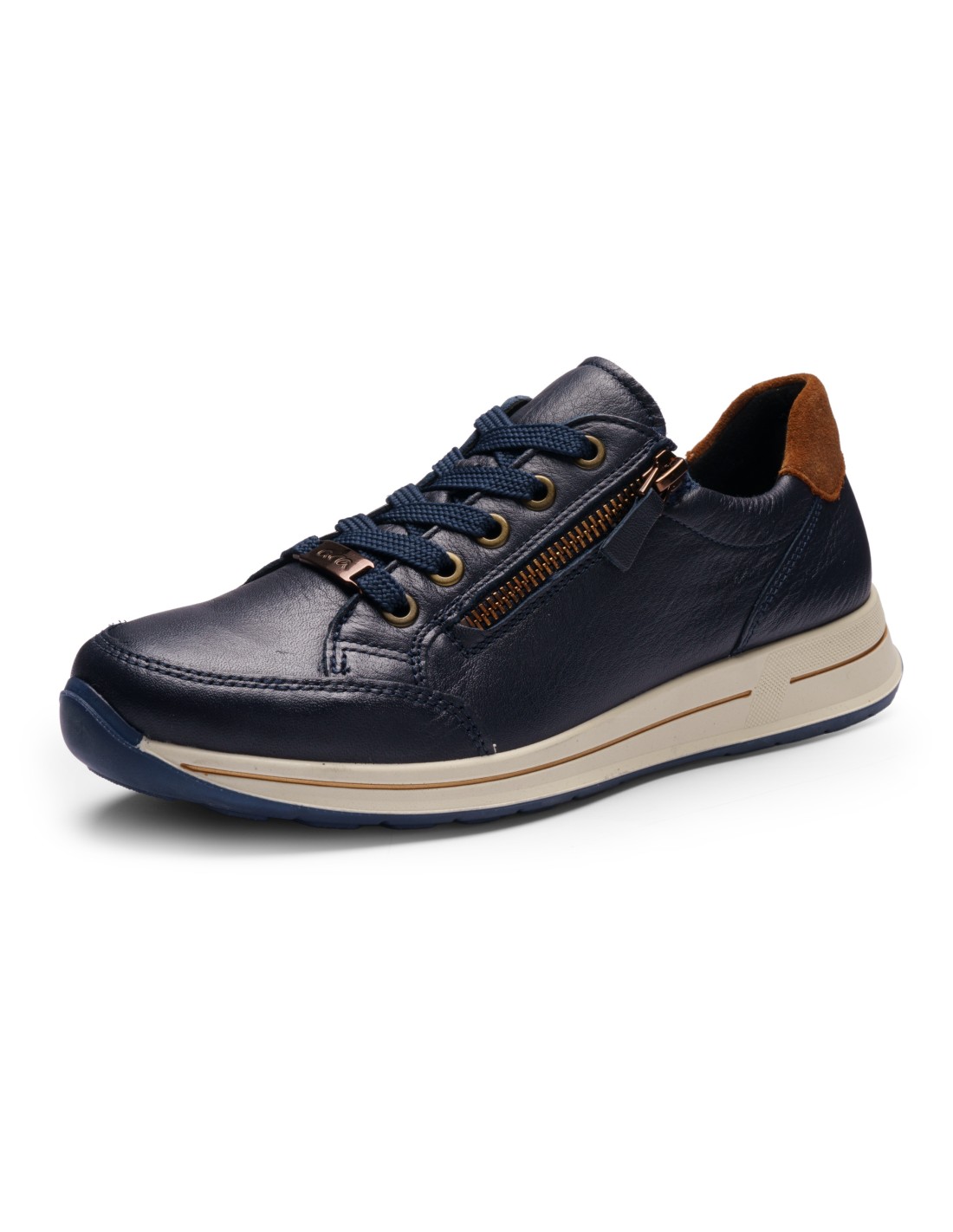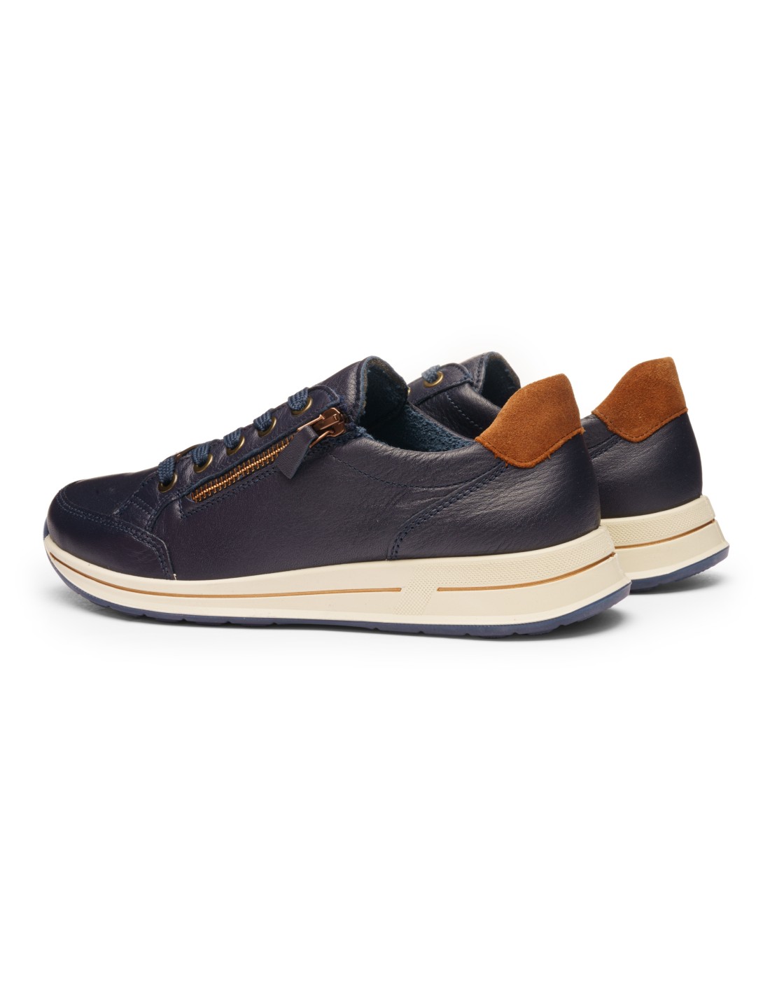 Este deportivo de señora de ara combina estilo, confort y materiales de alta calidad, ideal para el día a día. Fabricado en piel azul suave, realzado con elegantes detalles en marrón, ofrece un diseño moderno, versátil y fácil de combinar con cualquier look casual. Su ancho H proporciona mayor amplitud en la zona del antepié, garantizando comodidad incluso para pies más anchos o sensibles.