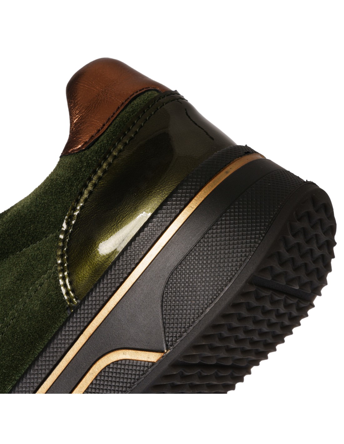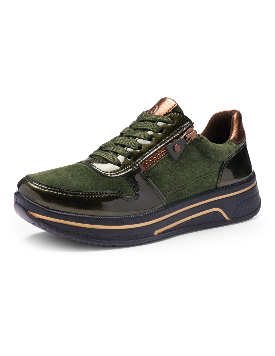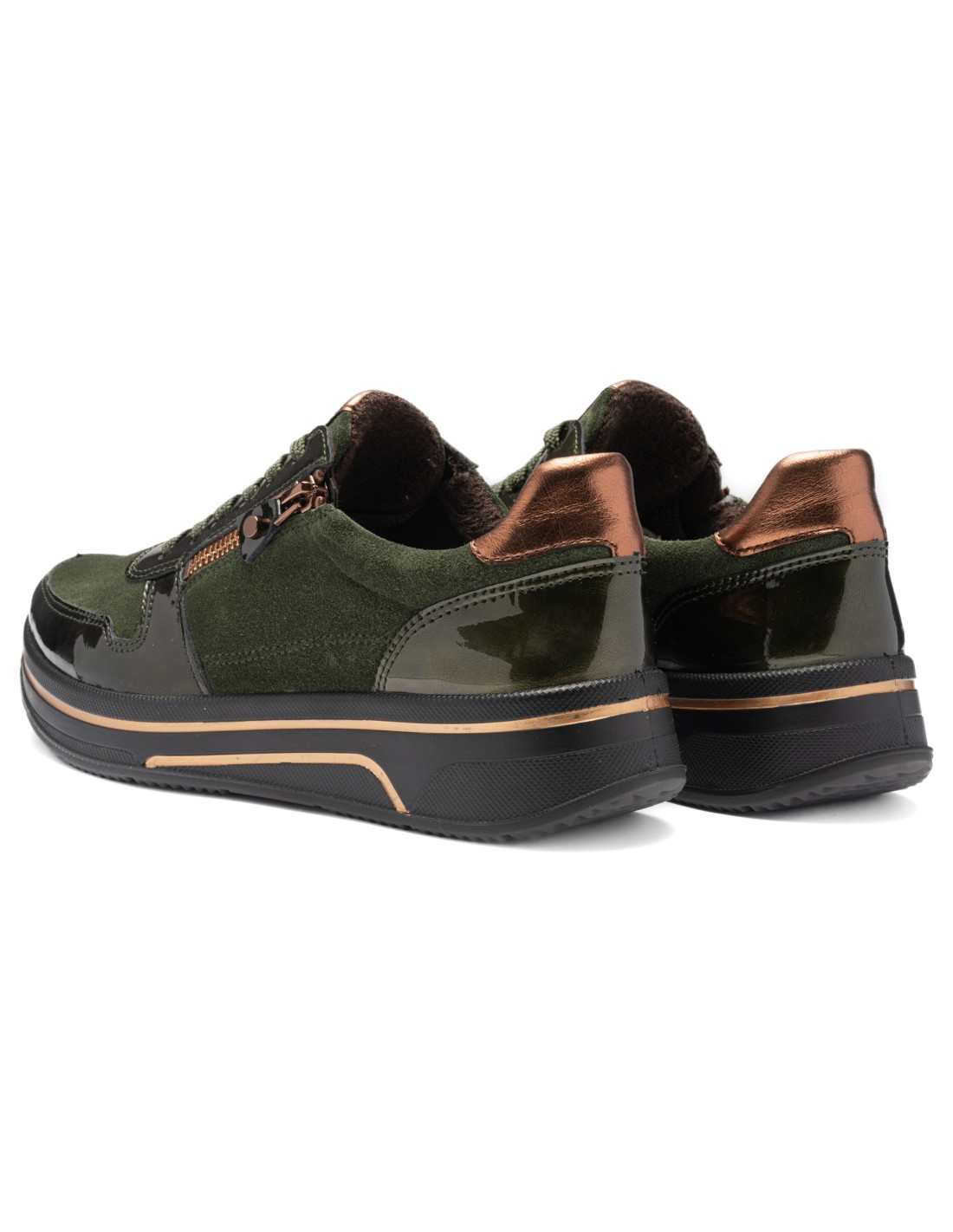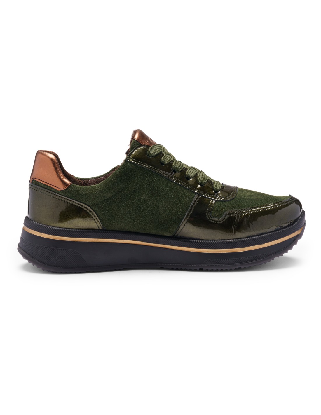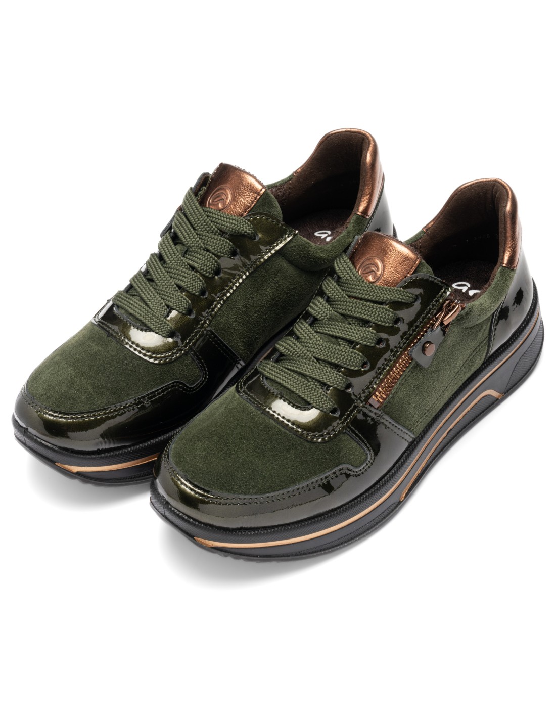 Este deportivo de ara destaca por su diseño moderno y elegante en combinación de verde, con detalles de charol metalizado y suaves acabados en velour, creando un estilo sofisticado y actual. Su mezcla de texturas le aporta un toque exclusivo sin renunciar al confort característico de la marca.