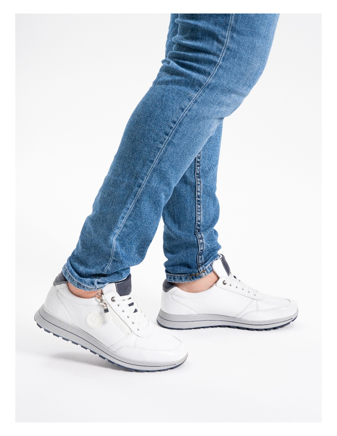 Zapatilla deportiva para caballero en piel blanca con detalles en azul. Con una cremallera en el lateral.El piso de poliuretano bicolor y una base dentada para mejor tracción.