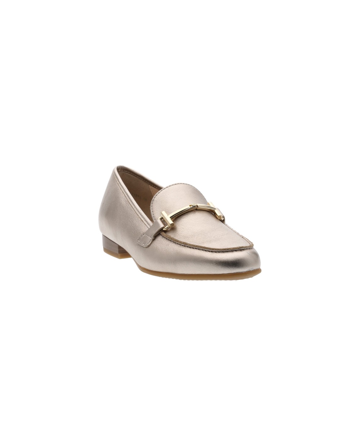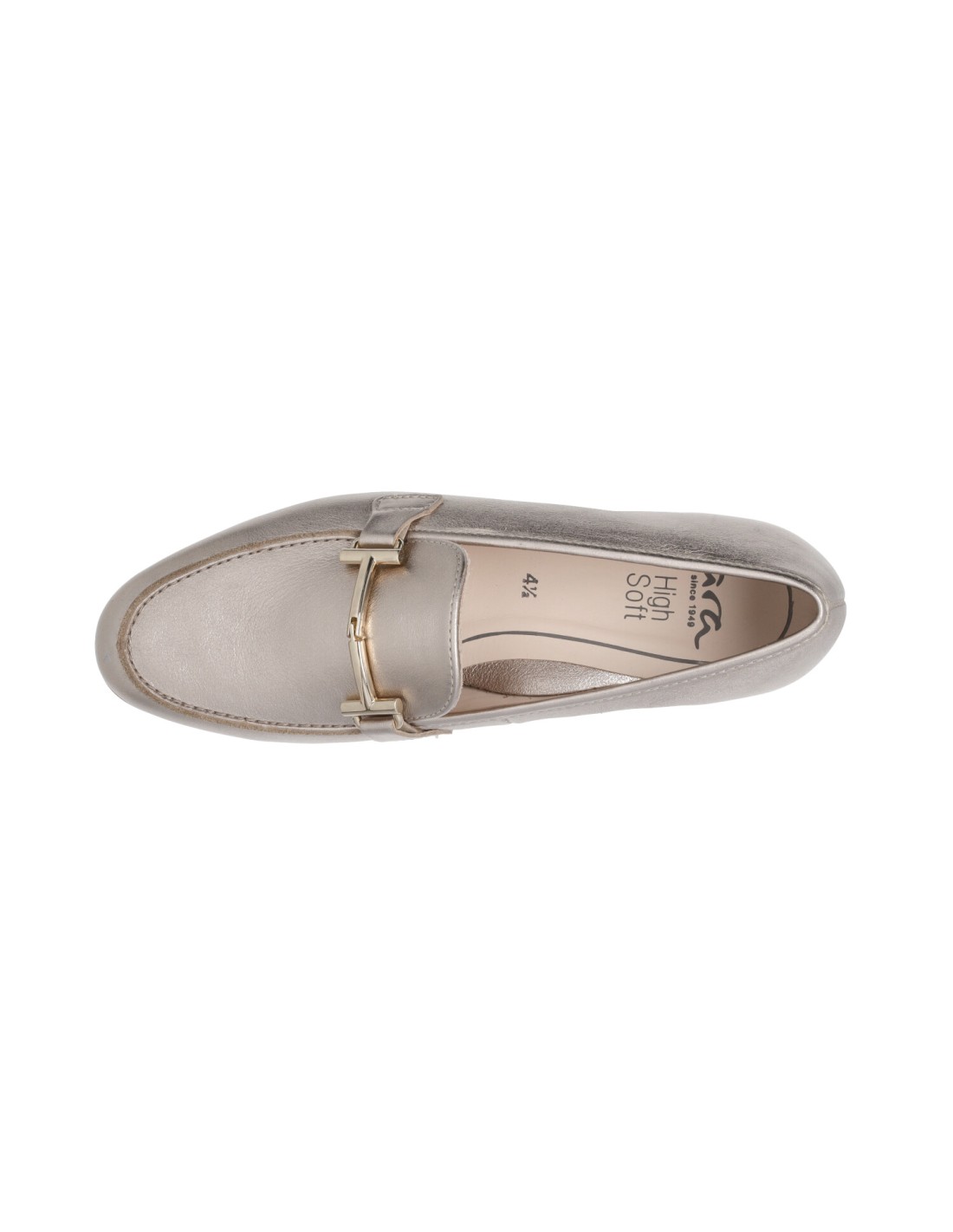 Mocasín con adorno metálico, piel Metalizada Platino, ancho F½, altura 15mm, función High Soft