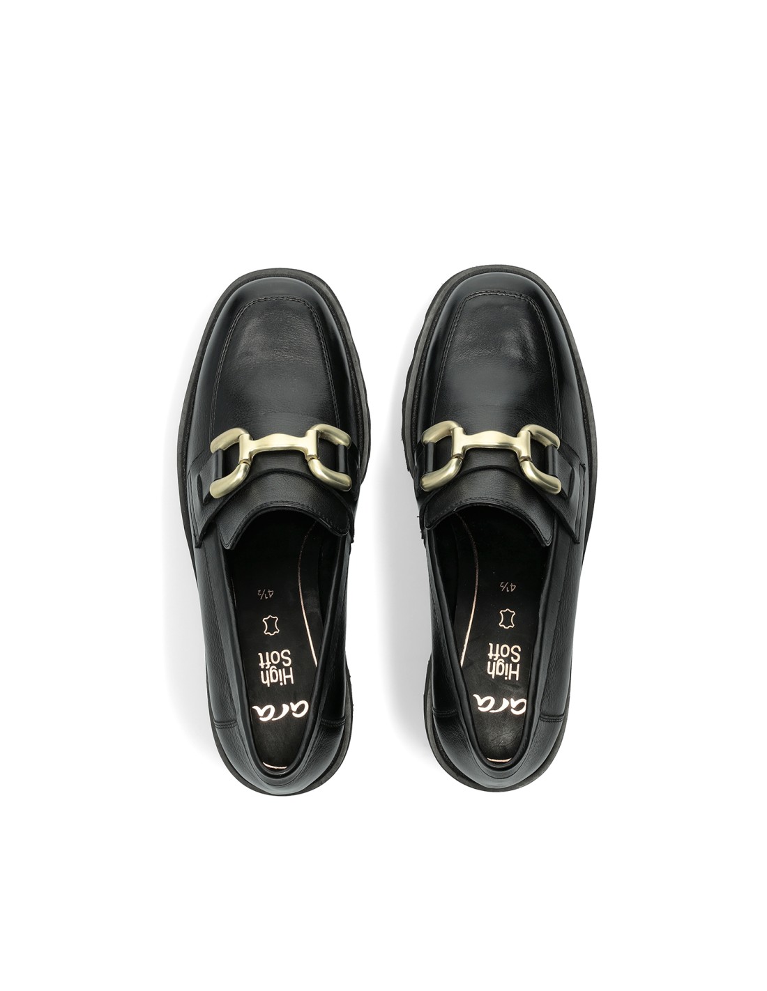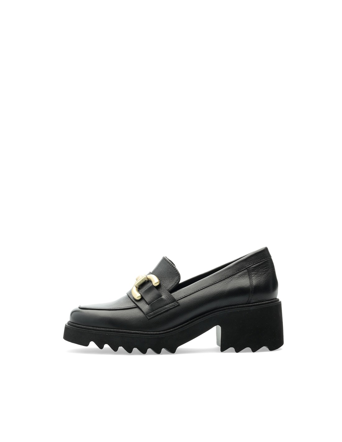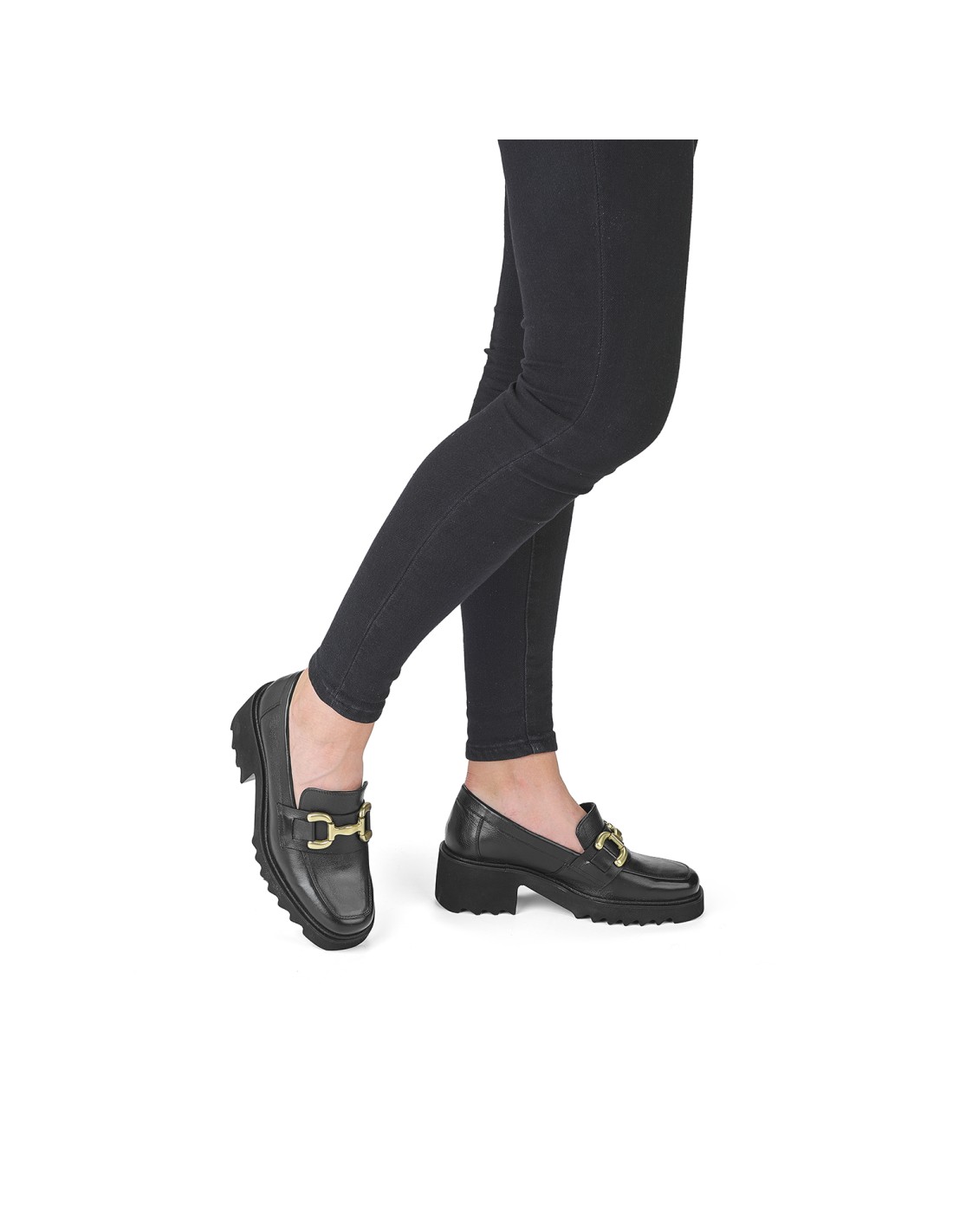 Mocasín juvenil con adorno metálico, en piel Negra, función High Soft