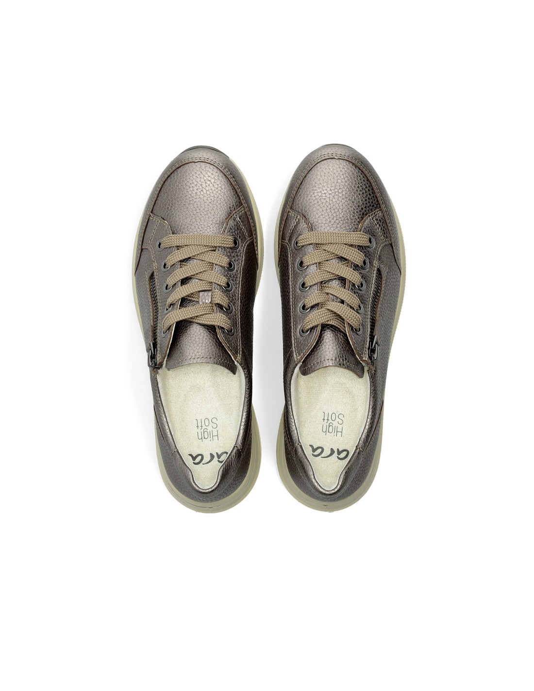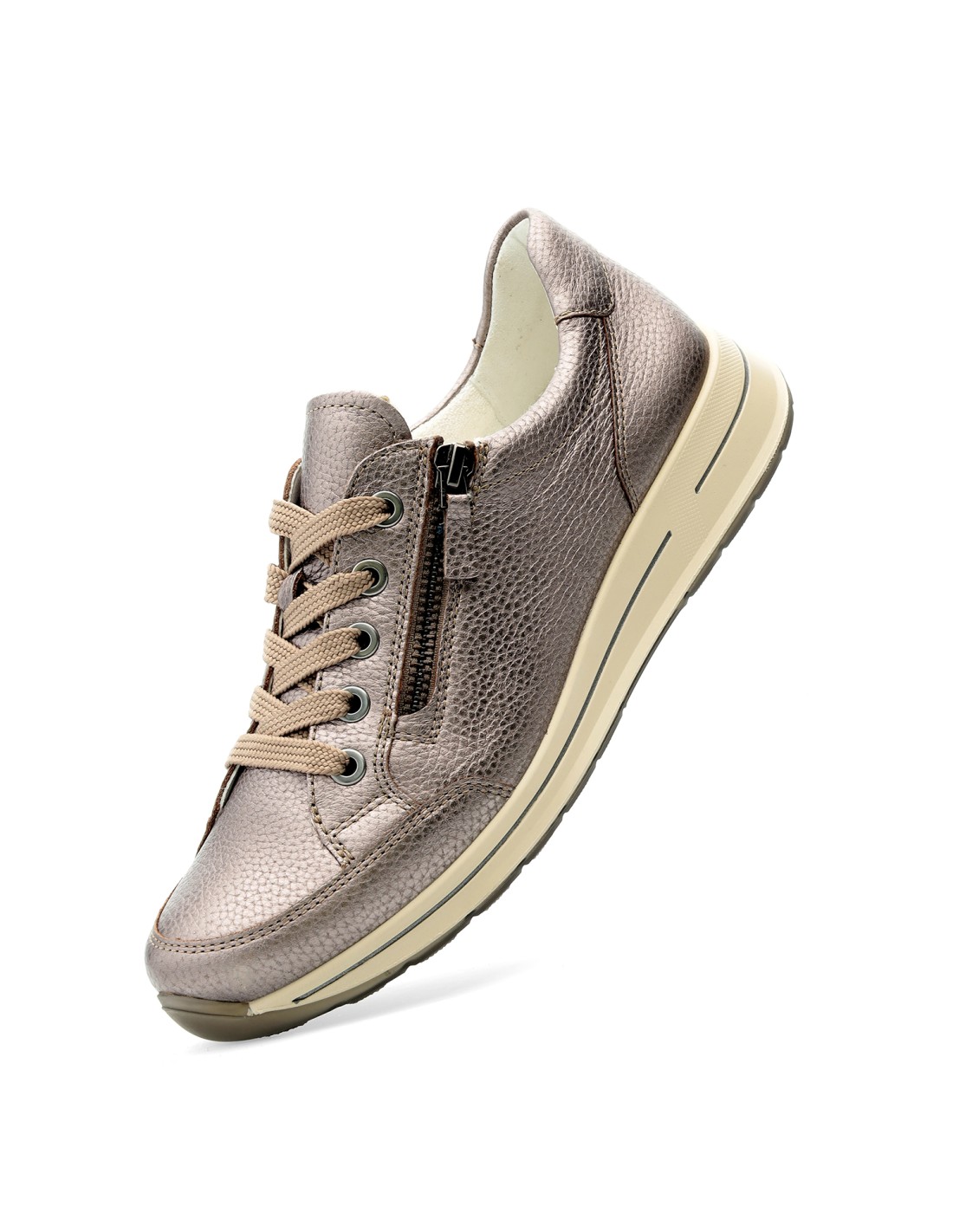 Sneaker señora, ancho H, en piel Metalizada Moon, cordones y cremallera, altura 30mm, funciones Bamboo, High Soft y plantilla extraíble