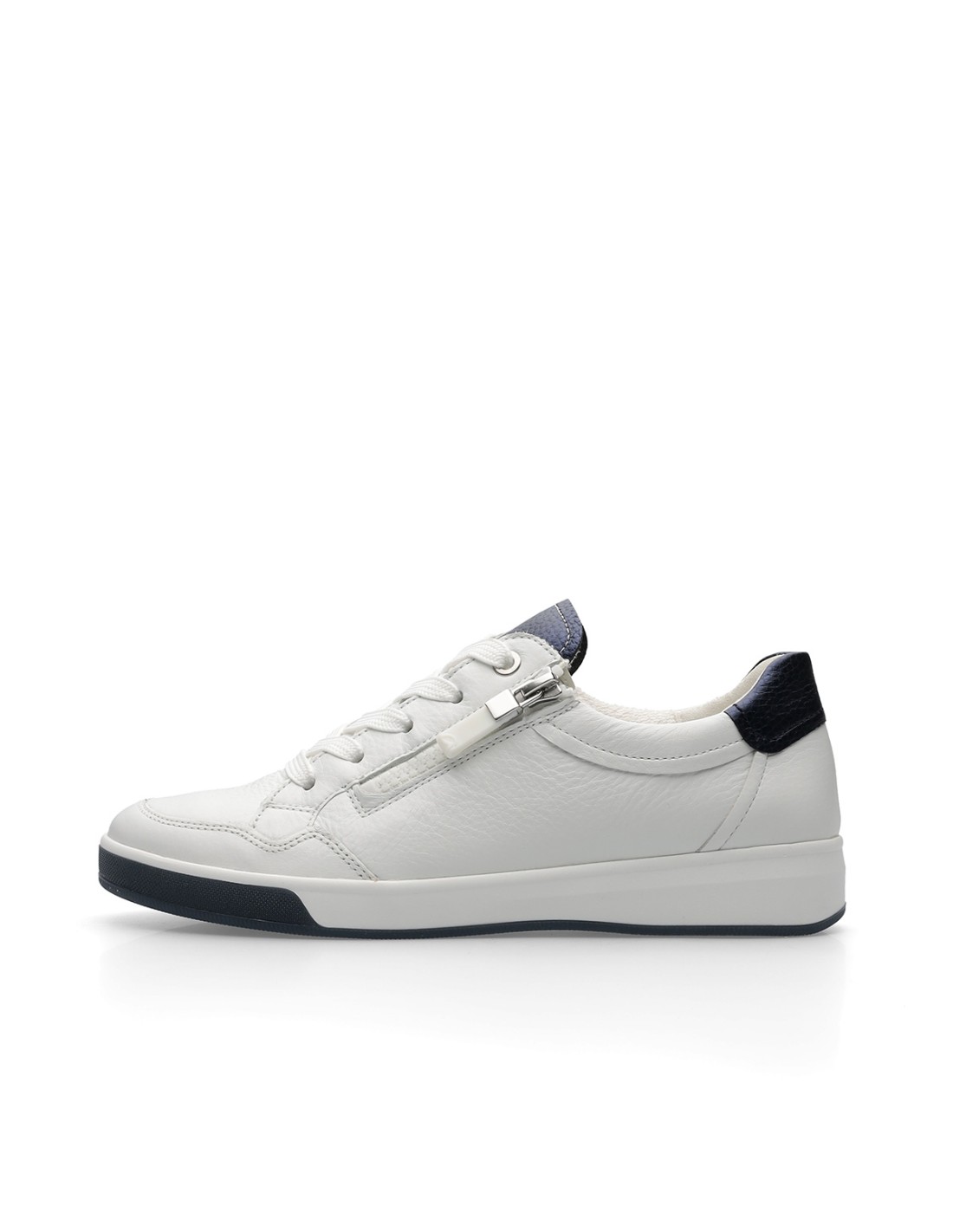 Deportiva de señora en piel Calf Blanco y combinado con Metalizado Azul, cierre con cordones y cremallera, altura 25mm, funciones High Soft, Bamboo y plantilla extraíble.