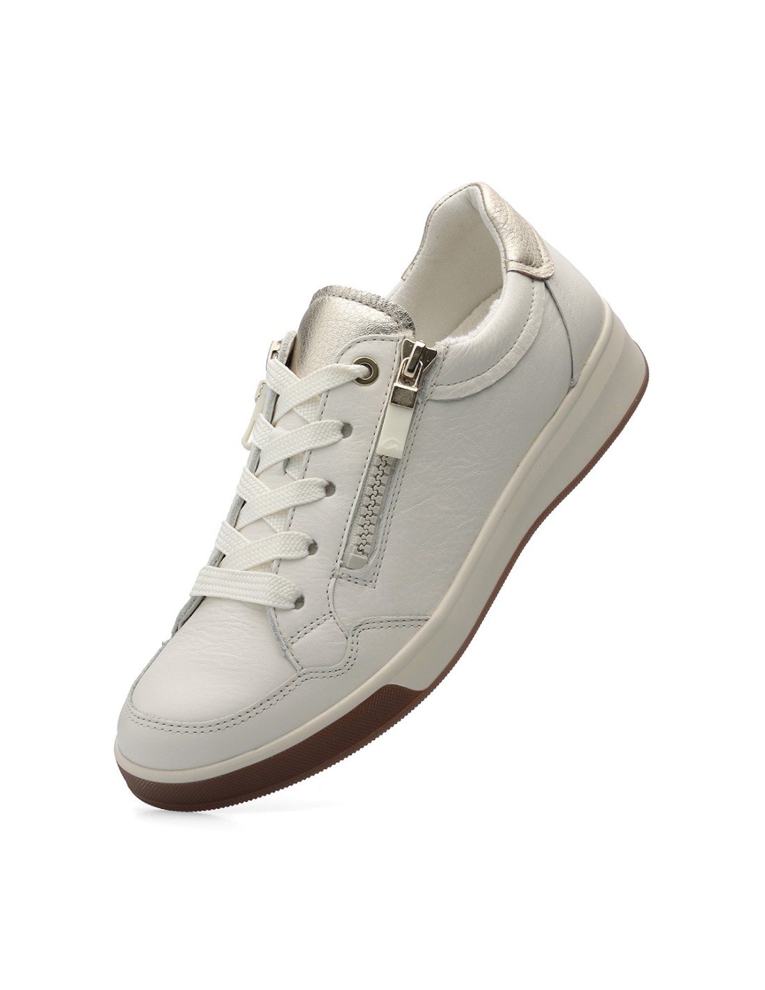 Deportiva en Calf Blanco y Metalizado Azul, cordones y cremallera, funciones High Soft, Bamboo y plantilla extraíble.