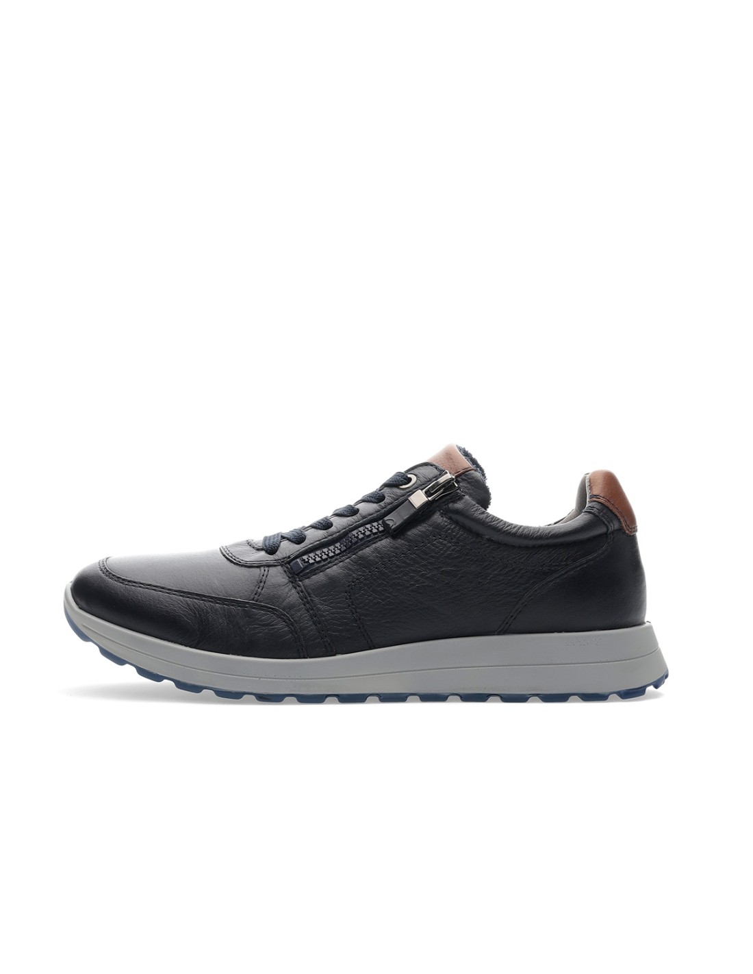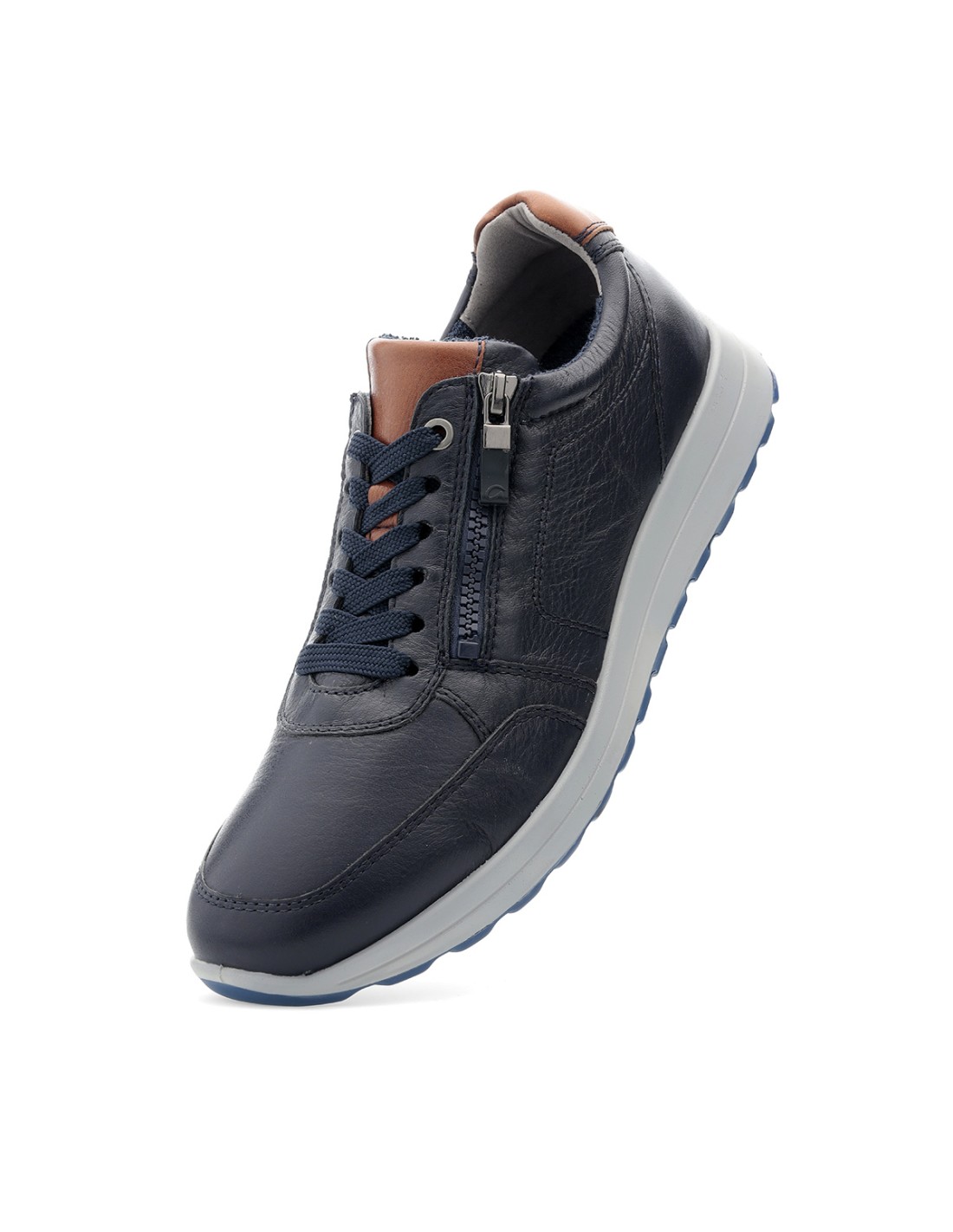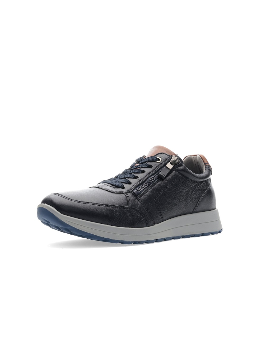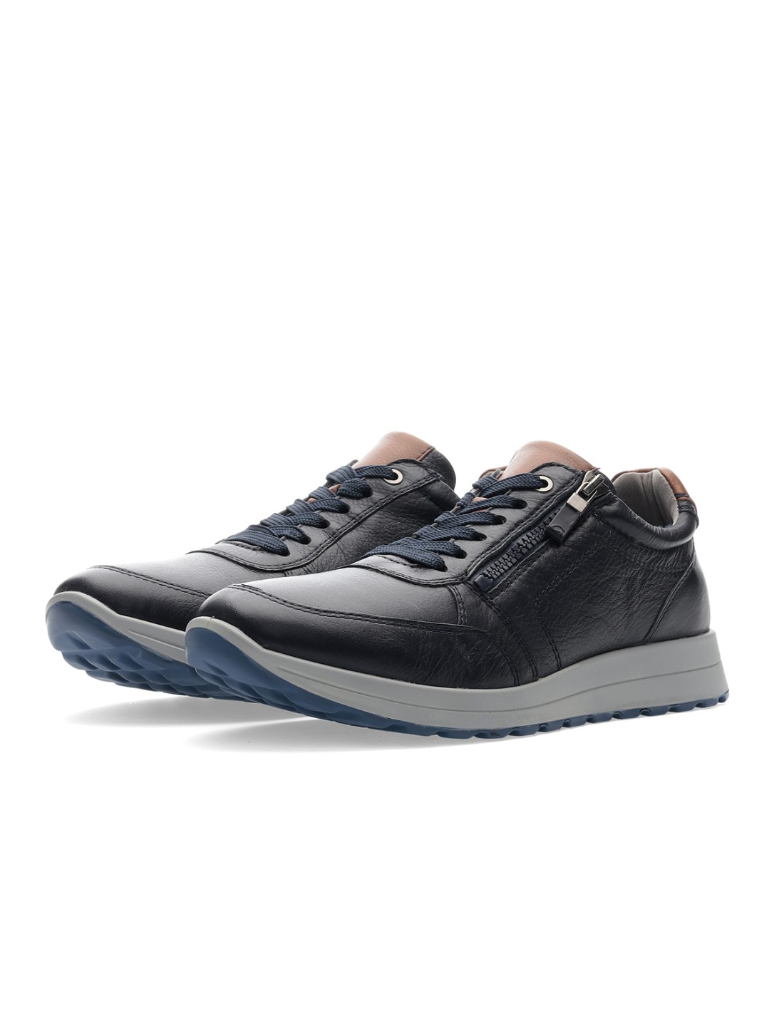 Deportivo casual, cordoneras y cremallera, piel Marino y Cognac, funciones High Soft y plantilla extraíble.
